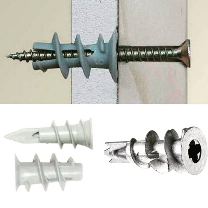 - Для пеноблоков применяют специальные пластиковые втулки. Главное их отличие — высокая резьба с крупным шагом, прямая или на конус.
