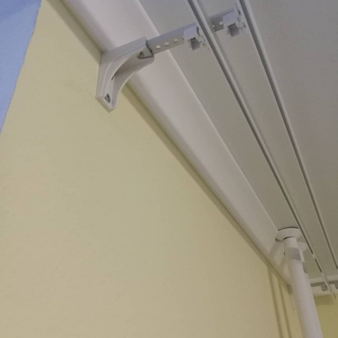 - Когда дюбели зафиксированы, на них вешают кронштейны и фиксируют их; на них устанавливают карниз, не забыв предварительно насадить на него кольца с прищепками.