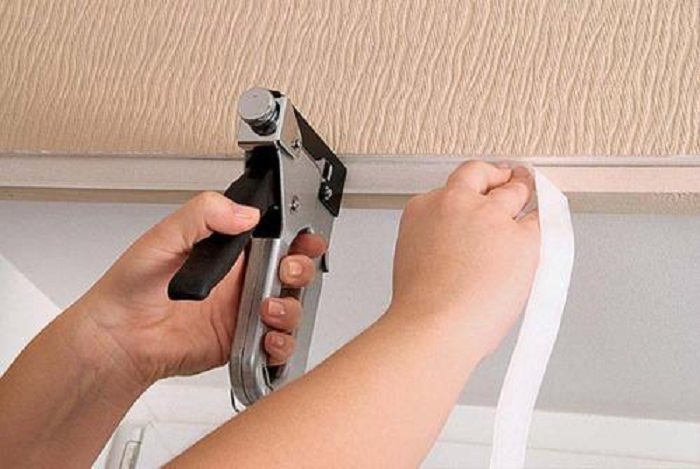 Шторная тесьма — практичный и изящный метод изготовить сразу петли для крючков и украсить верхний край. По всей длине тесьмы прошивается шнур, которым можно регулировать количество складок. Можно использовать однорядную или двухрядную тесьму. Если багет или декоративная планка отсутствуют, то лучше повесить за петельки расположенные во втором ряду, поскольку драпировка будет закрывать места крепления ткани к карнизу.