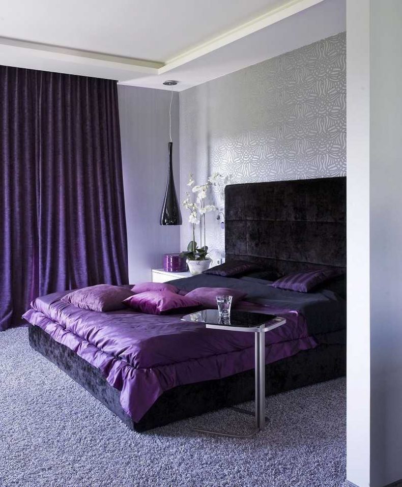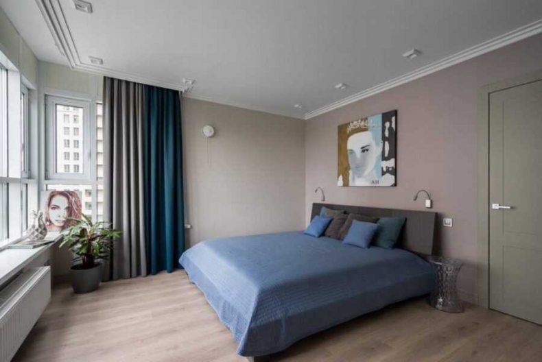 Холодные тона в спальне обычно не приветствуются. Но в это году на пике популярности серые, ореховые, коричневые и особенно фиолетовые цвета. Оттенки фиолетового варьируются от самых бледных до сочных. Спальная комната обрамляется шторами в мягкой палитре: фиалковой и лавандовой.