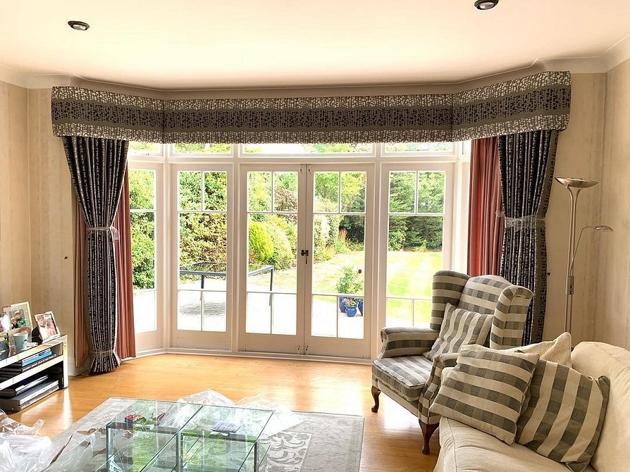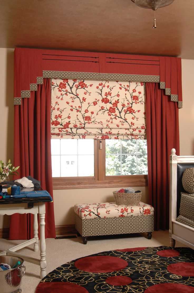 Ламбрекены превосходно сочетаются с различными занавесками. Контрастным или незаметным фоном будут портьеры, гардины, двойные шторы, тюль, римские, французские, рулонные, плиссированные и другие виды занавесок.