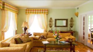 Для кантри стиля подойдут простые, неброские модели ламбрекенов. Ткань может быть украшена узором или мелким рисунком.