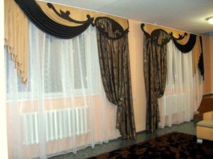Хорошо смотрятся в зале комбинированные ламбрекены, в которых жесткие конструкции сочетаются с мягкими. Такие модели придают комнате праздничную роскошь и торжественность.