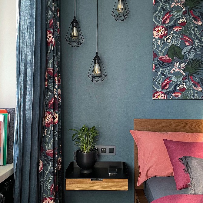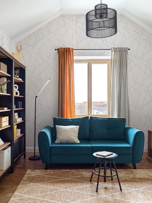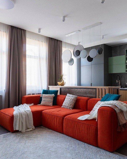 - Занавески могут стать ярким акцентом в комнате. Подбираются насыщенные цвета полотен, которые повторяются в деталях интерьера: покрывала и пледы, наволочки подушек на диване или кровати, оттенок или принт обивки мебели, ковер, рамки для картин, рисунок на обоях, основание светильников.