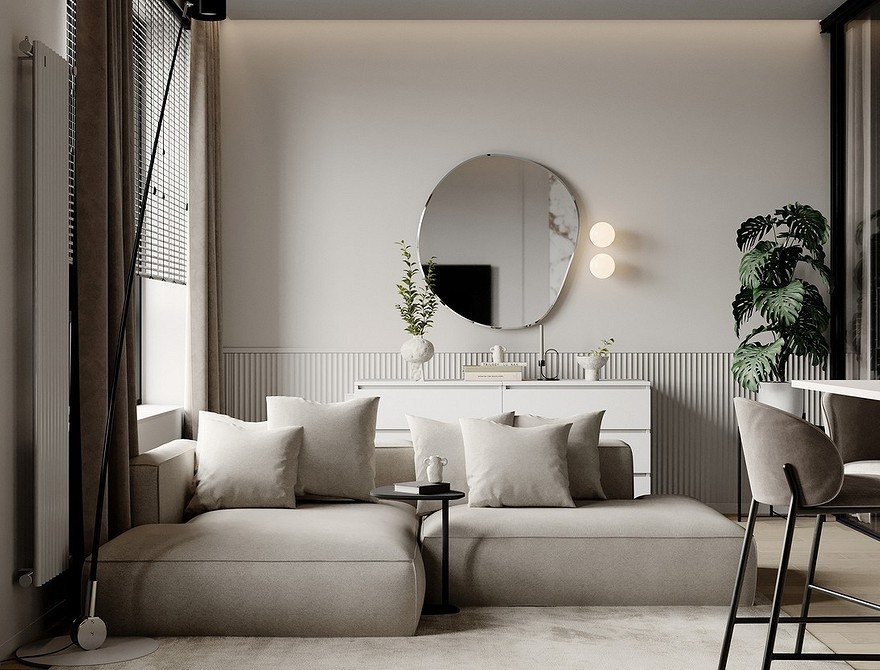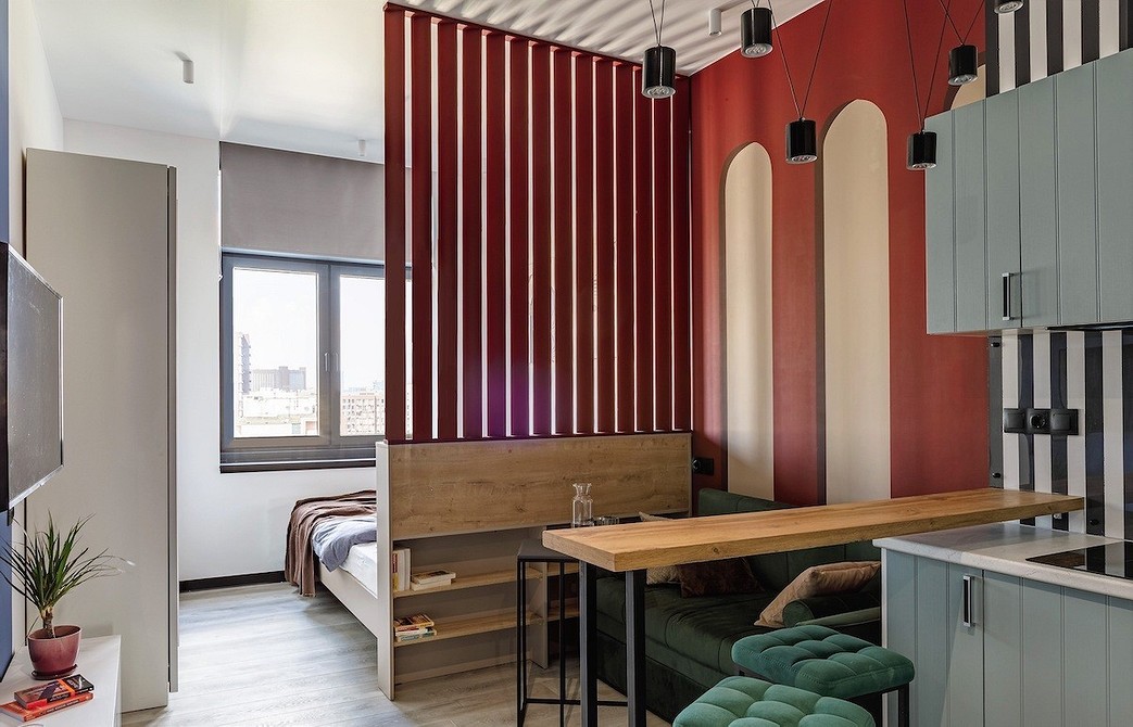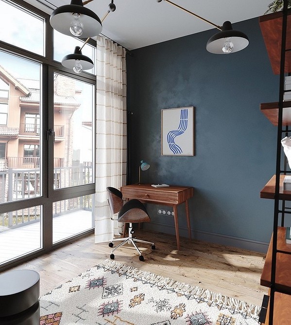 - Можно выбрать цвет похожий на отделку стен ‒ на один, два тона светлее или темнее. Такое решение идеально для небольшого пространства.