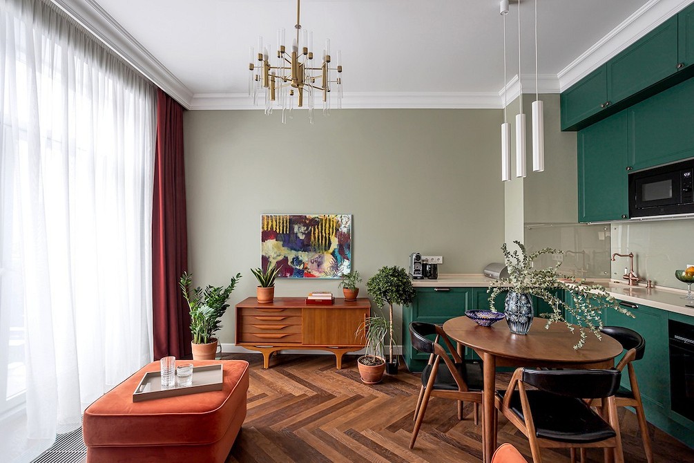 Наряду с природной палитрой гостиная допускает использование достаточно ярких, насыщенных, но глубоких, сложных цветов.
