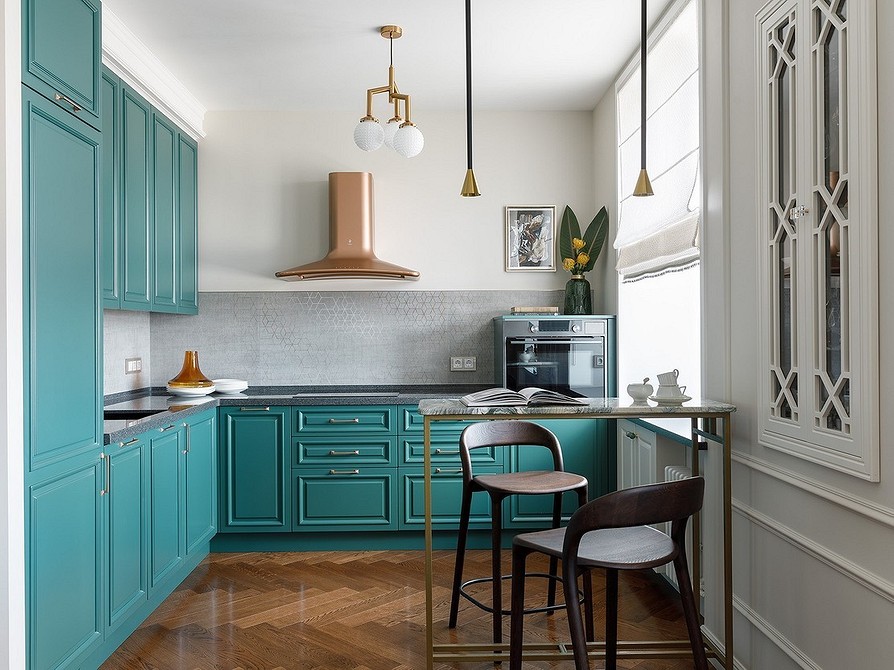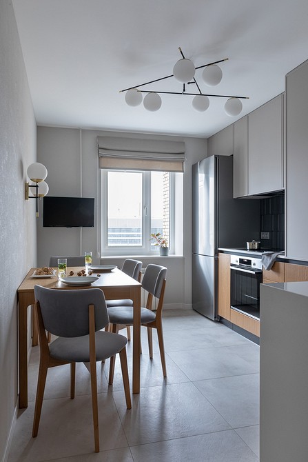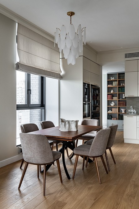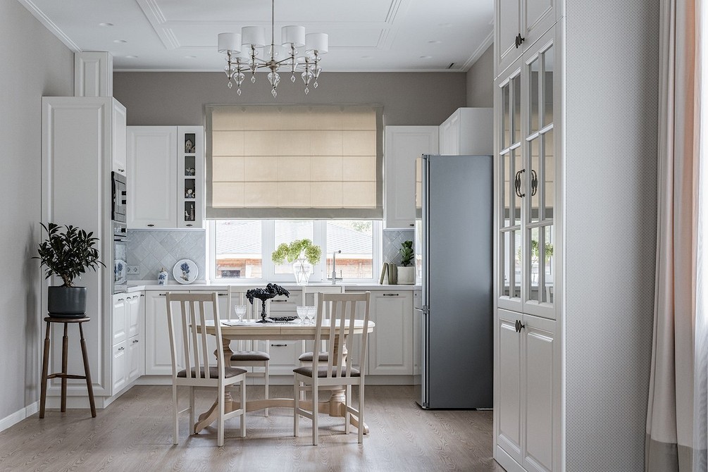 Это сложное помещение с точки зрения его функционирования и микроклимата внутри. Пар, перепады температуры, влажность, запахи еды — вот те факторы, которые нужно учесть. Шторы в пол подойдут для просторных комнат, где есть место для гарнитура, отдельной обеденной группы и удобных проходов между ними. Длинные, объемные модели лучше не размещать рядом с газовой плитой и другими источниками потенциальной опасности.