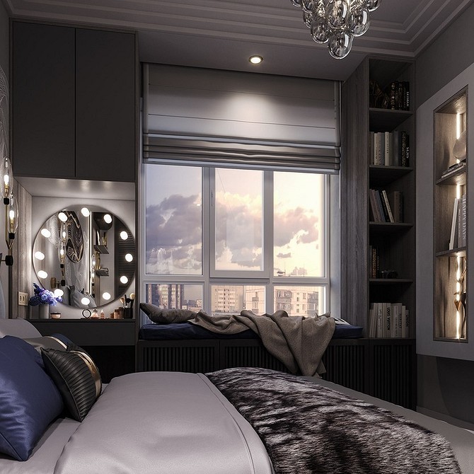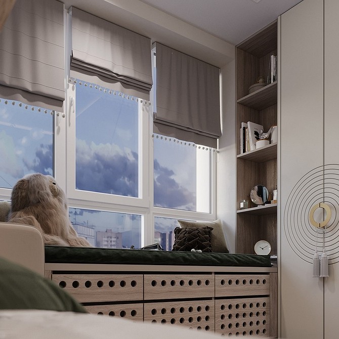 Чаще всего для спальни выбирают классический дуэт портьер и тюля. Но нередко именно в этой комнате организуют рабочее место, а в качестве столешницы используют подоконник. Или у окна размещают туалетный столик. Еще один вариант — превратить подоконник в уютный диван. Во всех этих случаях удачным решением будет заменить традиционные занавески на римские или рулонные, либо на жалюзи.
