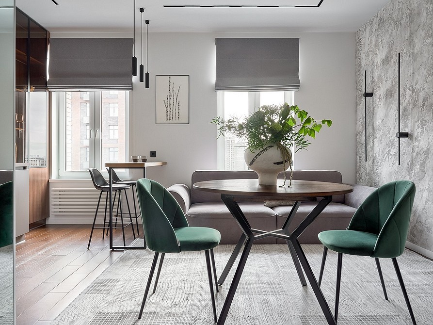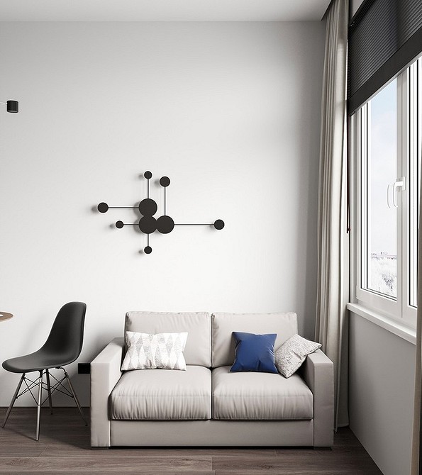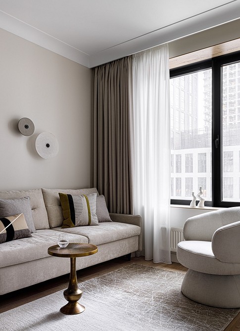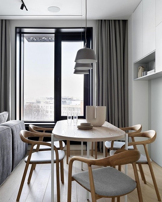 В компактных комнатах, где нет возможности соблюсти удобные расстояния, лучше будет смотреться текстиль с подъемным механизмом либо укороченные варианты, длиной до подоконника. Также удачным выбором станут жалюзи. Хорошо, если текстильные полотна будут обработаны пропиткой для защиты от влажности и возгорания.