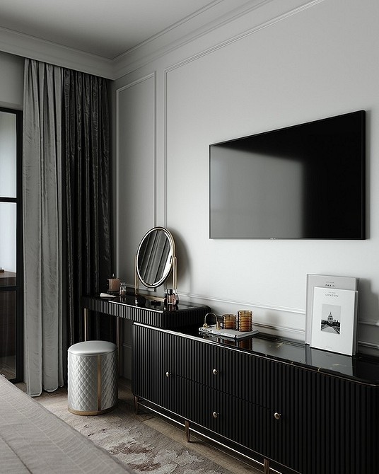 - Шторы с рисунком подойдут для монохромного интерьера.