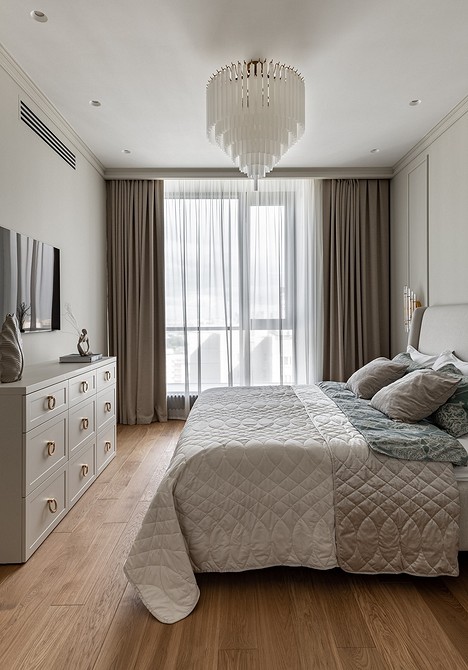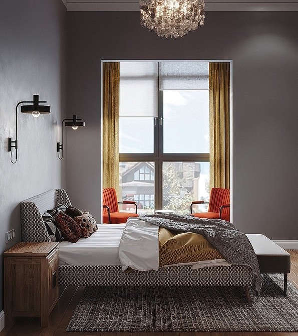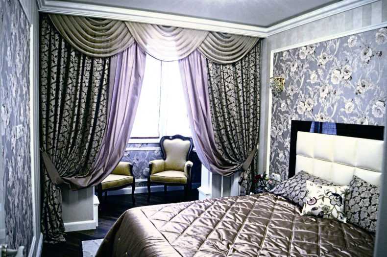 - В спальню следует выбрать плотную ткань для занавесок, которая защитит от лучей солнца и посторонних взглядов (текстиль выбирается под дизайн интерьера комнаты: жаккард, хлопок с полиэстером, лен, тафта, шелк, парча).