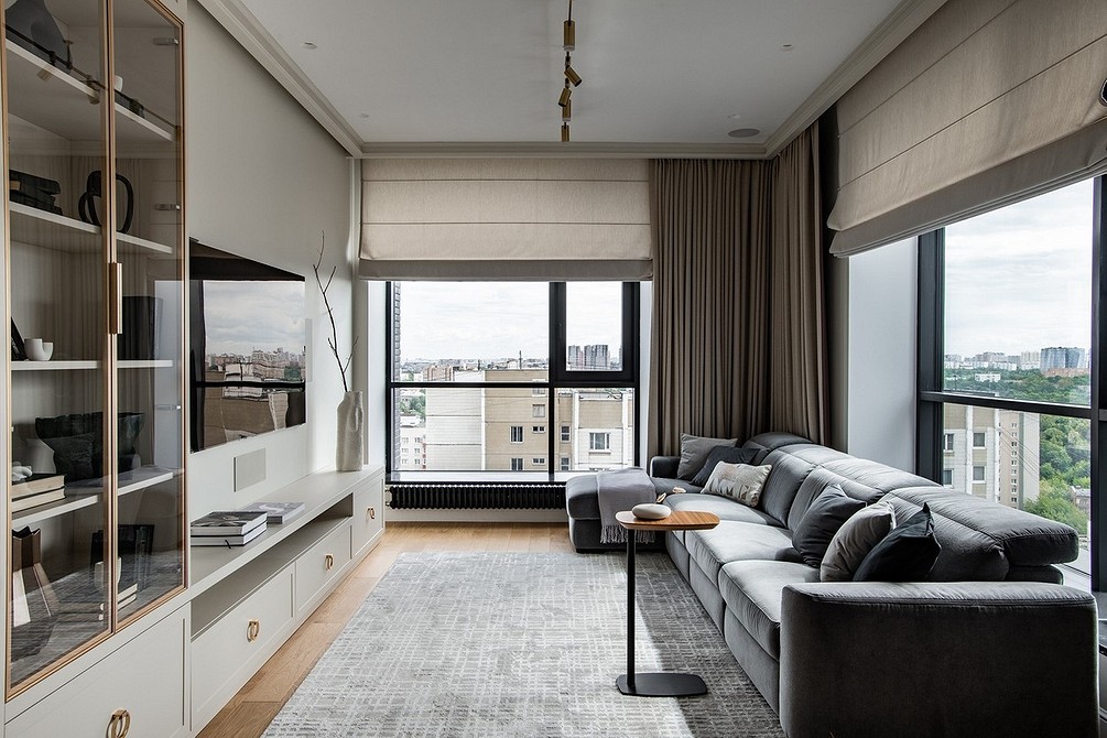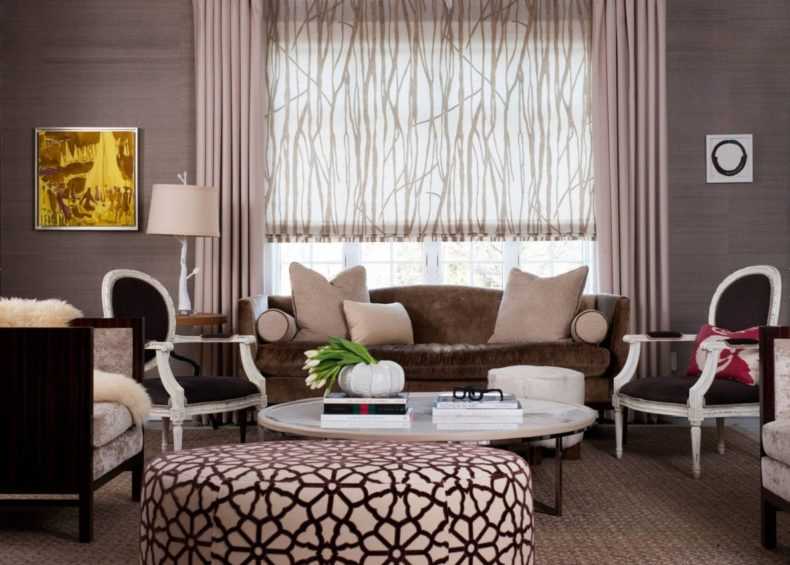 Для гостиной подойдут и другие виды оконного декора: римские занавеси, рулонные, жалюзи. Это то помещение, где будут хорошо смотреться многослойные решения.