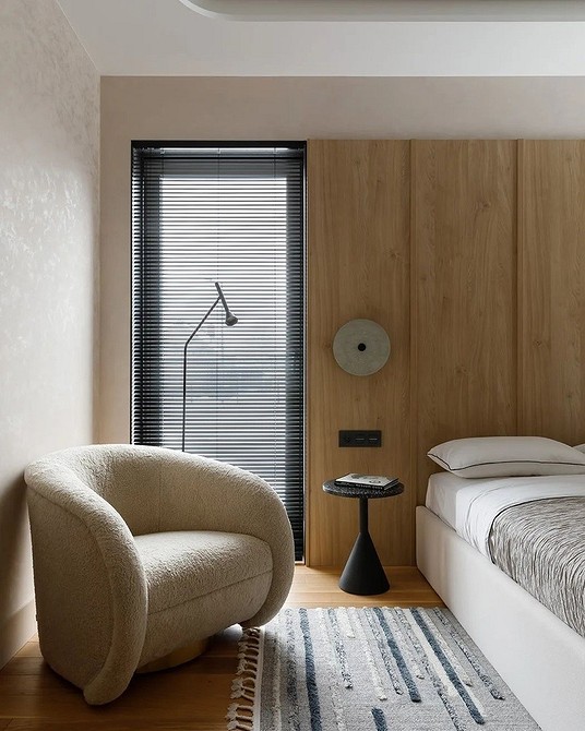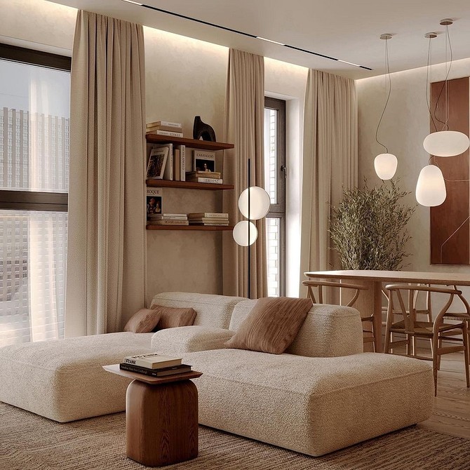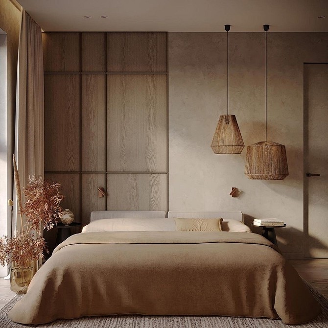 В таких пространствах не встретишь много декора, ярких цветных акцентов, насыщенных принтов. Текстиль — простой, однотонный. Интерьеры в стиле джапанди очень близки к экостилю. Поэтому предпочтение отдается природным оттенкам, натуральным тканям.