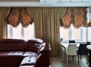 - В гостиную можно выбрать пышные модели, чтобы создать ощущение праздника (в гостевой комнате часто собирается много людей, подойдет ткань, которая легко стирается: вискоза, велюр, лен, шелк). Из бархата и парчи получится хорошая драпировка и ламбрекен.