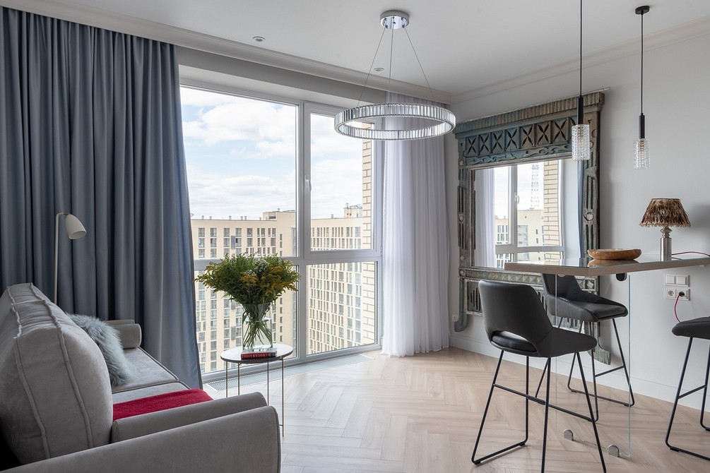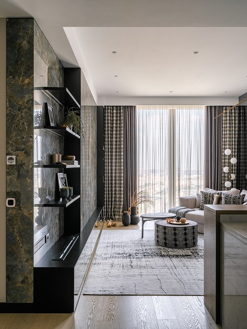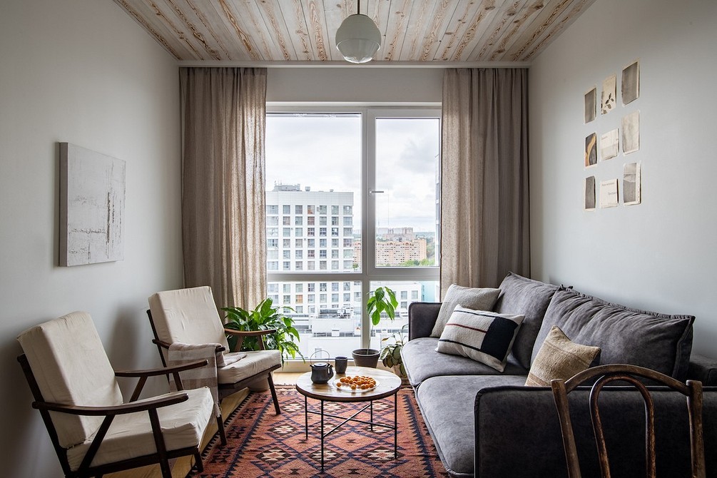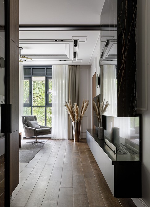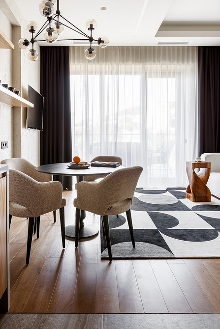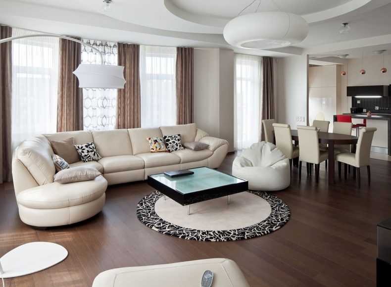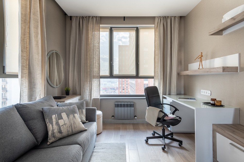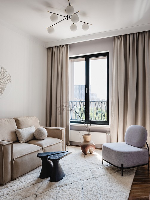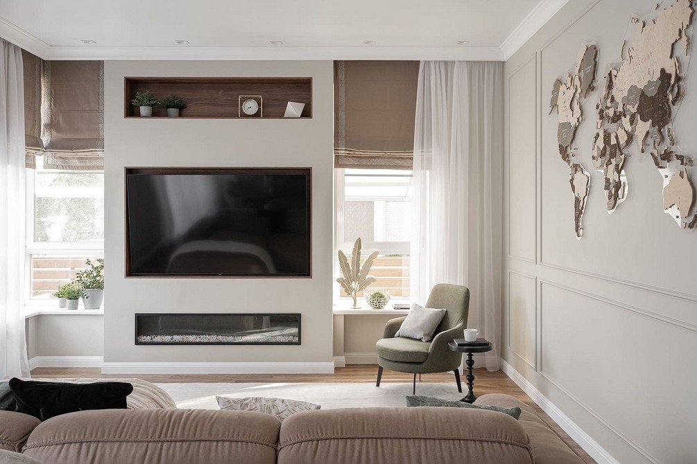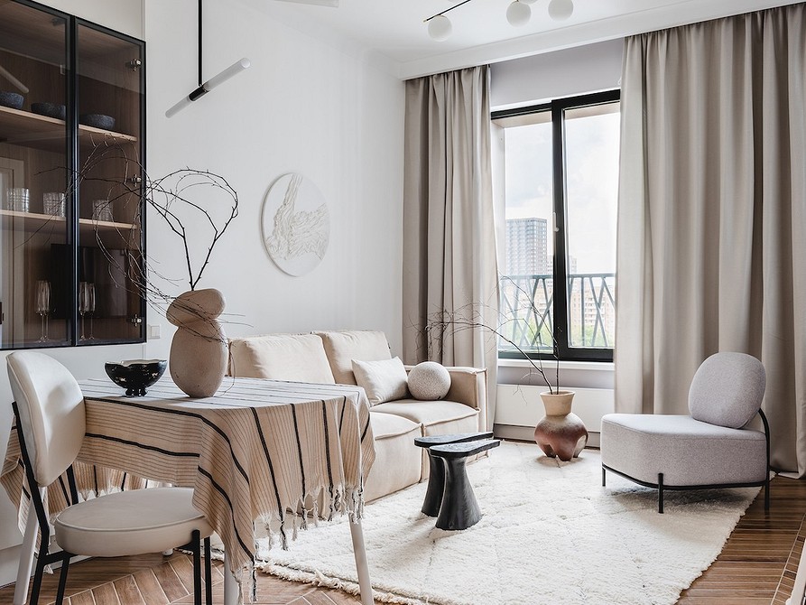 В подобных гостиных шторы служат не украшением, выполняют функциональную роль. Они обычно простые, с четкими линиями, без декора. В такой обстановке один элемент плавно перетекает в другой, ничто не отвлекает, не напрягает глаза.