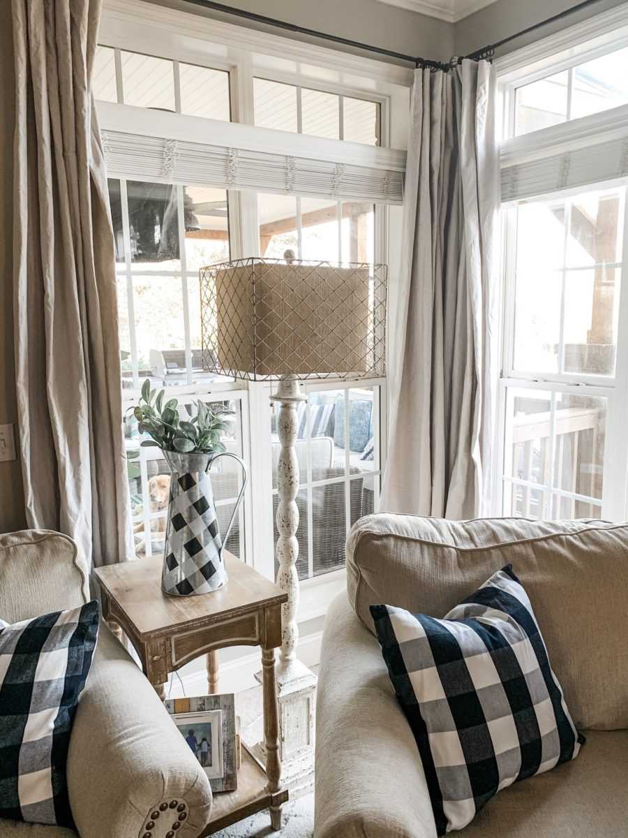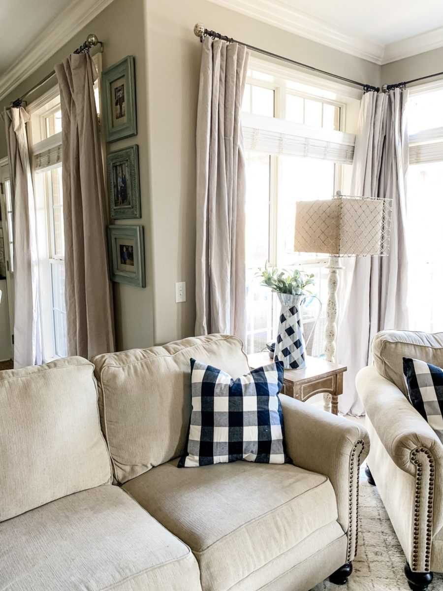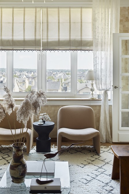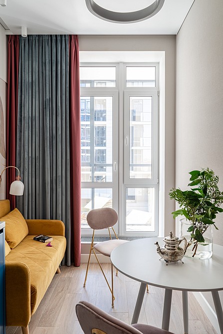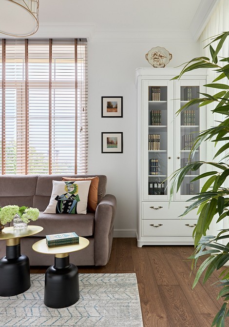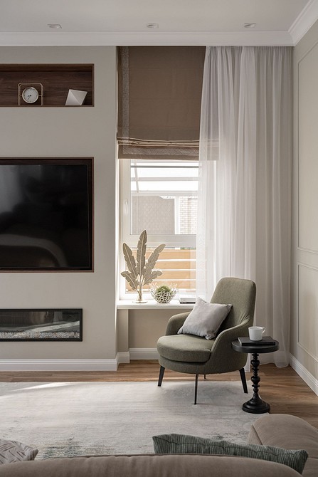 С рулонными шторами все понятно: конструкция проработана заранее. Ее нужно просто закрепить над окном. А вот классические занавески можно крепить по-разному. Благо, гостиная позволяет и это!