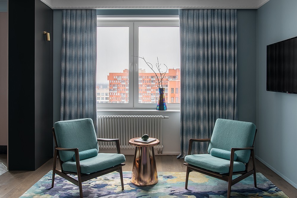 · Тюль, повторяющий рисунок гардин — интересное решение, создающее иллюзию градиента на окне.