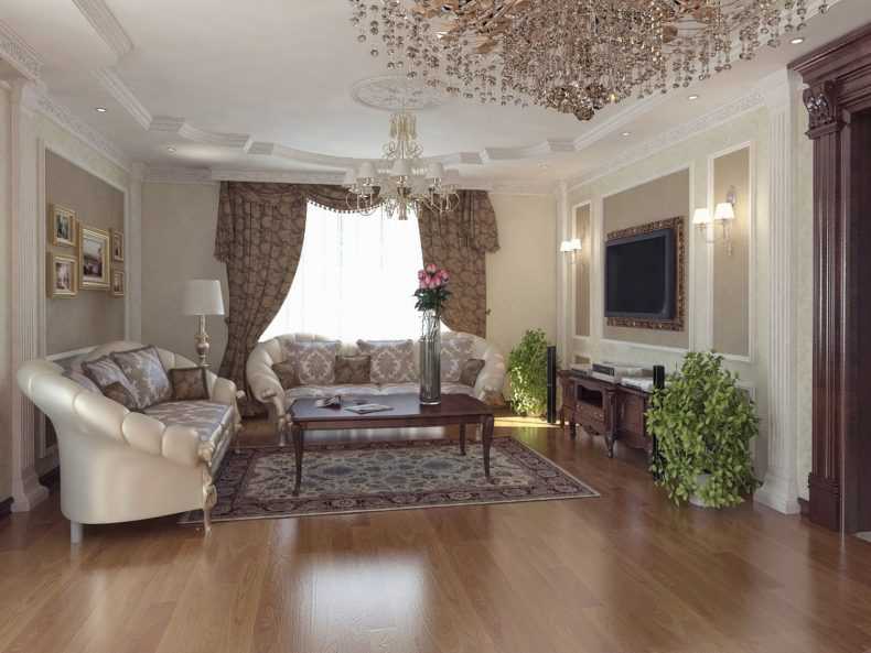 Классический интерьер всегда в моде. В таком стиле чаще всего оформляют главную комнату — гостиную. В классике выбирают плотные портьеры с легким тюлем. Могут быть добавлены ламбрекены, нити, кисточки. Главное, чтобы цвет сочетался с обстановкой.