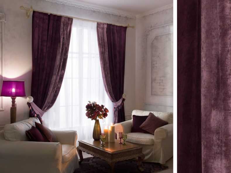 • Бархат — плотная тяжелая ткань, защищающая гостиную от солнца. Широко применяется в классическом и готическом стиле.