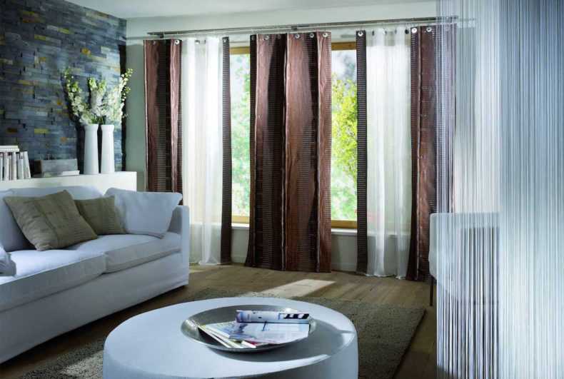 Кроме того, почти во всех интерьерах очень эффектно выглядят шторы нити, повешенные поверх длинных занавесок и красиво задрапированные.