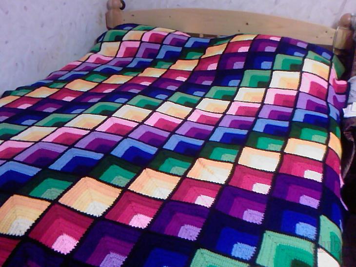 В отличие от предыдущих техник этот петчворк создается без сшивания лоскутов. Во-первых, используются не куски ткани, а вязанные клочки различных цветов, но изготовленные из одинаковых по типу ниток. Во-вторых, эти клочки связываются, а не сшиваются, что позволяет создать оригинально вязанное одеяло в стиле печворк.