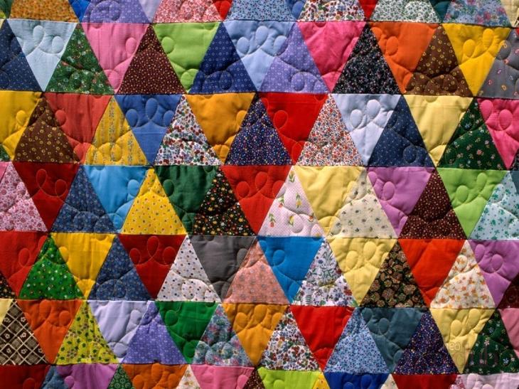 Одеяло, созданное из различных треугольных лоскутов, выглядит колоритно и декоративно благодаря тому, что с помощью этих геометрических фигур можно создать различные рисунки и узоры. Техника довольно проста и она подходит для начинающих, а принцип создания одеяла заключается в сшивании сторон равнобедренных треугольников.