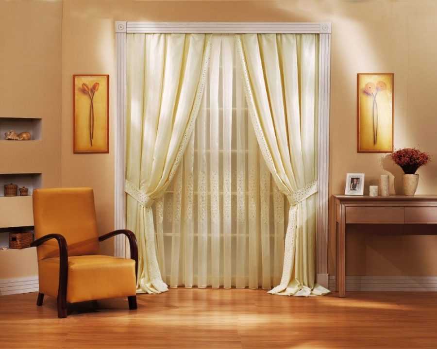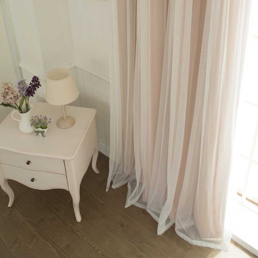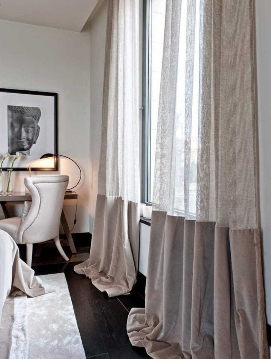 Когда плотные портьеры лежат на поверхности пола, тюлевая занавеска по длине может быть короче. Полотна должны гармонировать по структуре ткани, оттенку, создавая слаженный ансамбль.