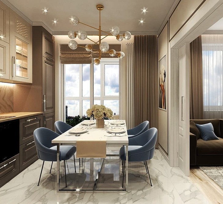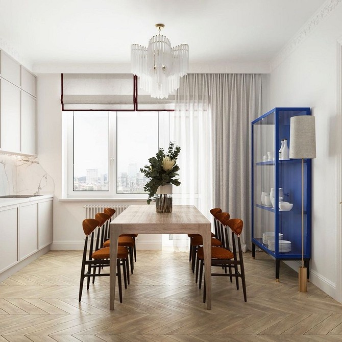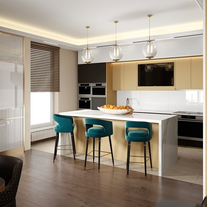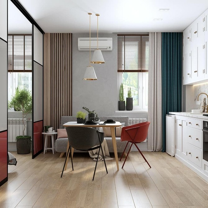 Чтобы наладить цветовой баланс в интерьере, текстиль можно сочетать с мебелью. Например, с обивкой кухонных стульев, кресел или дивана в кухне-гостиной, или с фасадами гарнитура.