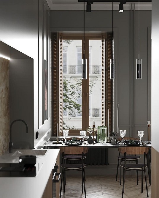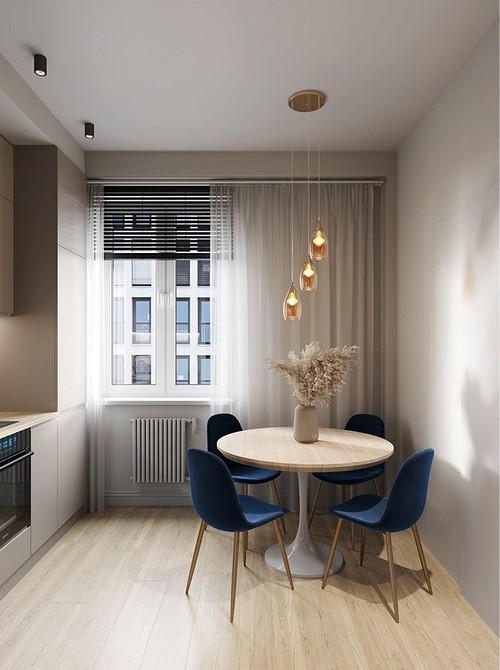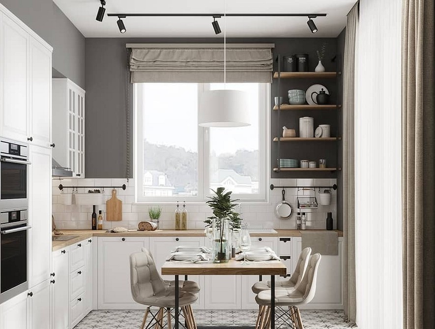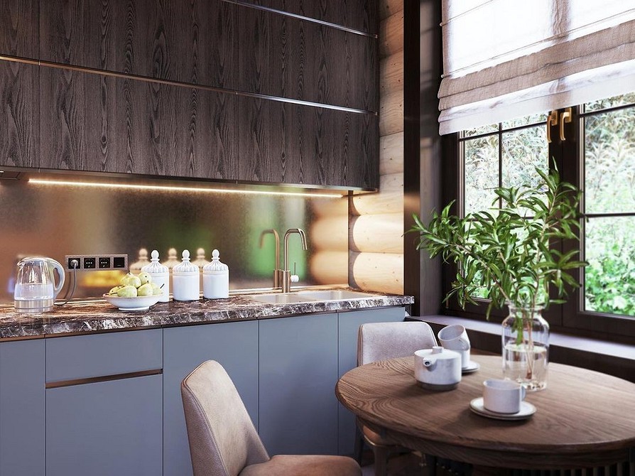Тёмные тона в маленькой кухне всегда используют дозированно; хорошим выбором будут бамбуковые шторы или деревянные жалюзи насыщенного тона. Однотонные лаконичные шторы из натуральной ткани, выполненные в тёмном оттенке серого или синего, удачно впишутся во многие современные стили.