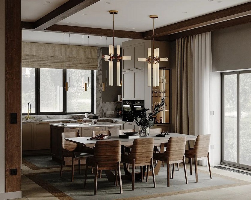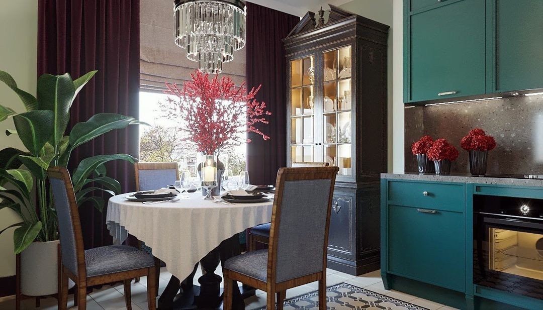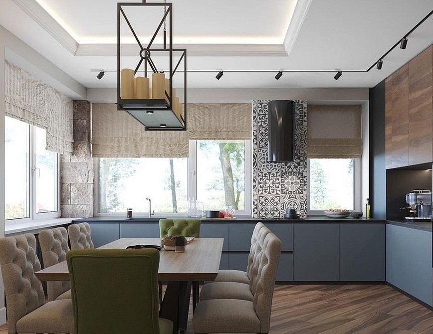 Размеры помещения должны быть внушительными. Окна, оформленные дорогими плотными тканями насыщенных цветов, выглядят, как произведение искусства. Часто они составляют главный акцент кухонной зоны.