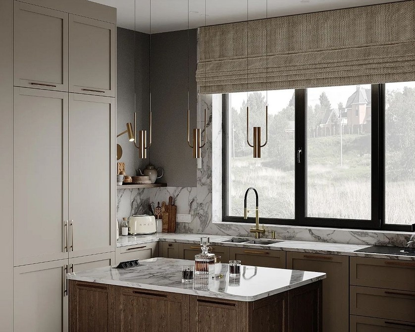 Ещё один уже практически вечный тренд. Для кухни такая модель очень удобна, так как представляет собой полотно и подъёмный механизм, закручивающий штору в рулон. В поднятом виде она может быть практически не видна, а в опущенном полностью закрывает окно, чем напоминает римскую штору. Этот вариант делают на заказ или приобретают в готовом виде.