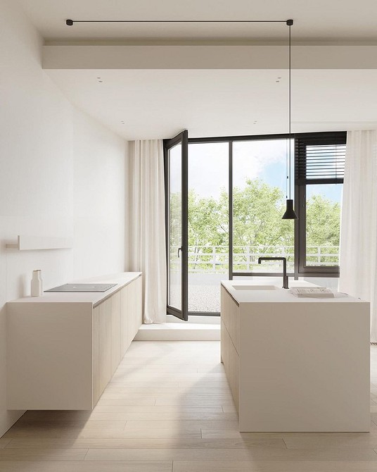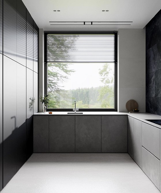 Рулонные шторы светлого оттенка на кухне хорошо вписываются в данный тип дизайна. Они защищают от солнечных бликов, пыли и при этом сохраняют свет, как бы расширяют пространство. Технология изготовления позволяет закреплять рулонные шторы практически на любой поверхности. Также используются жалюзи и однотонные ткани без каких-либо дополнений. Основной принцип – ничего лишнего.