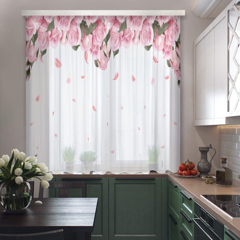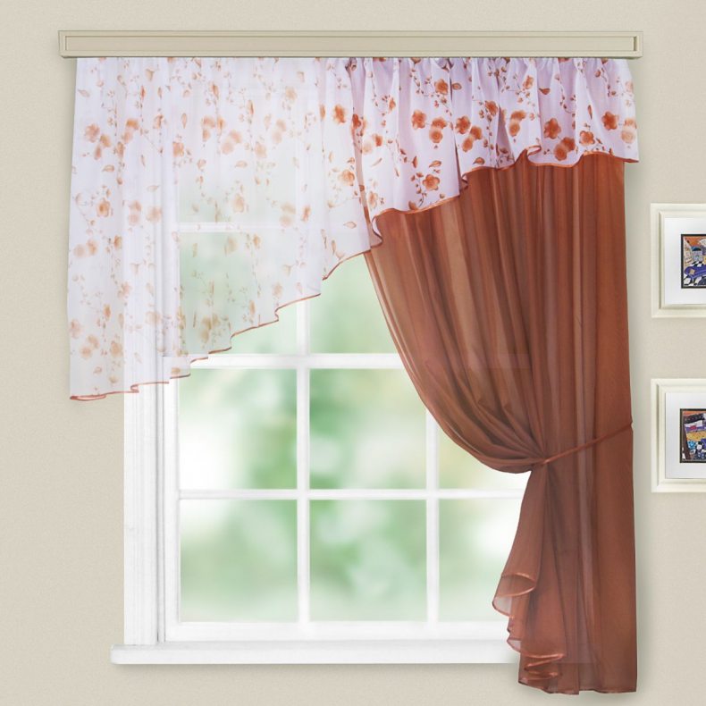 Это легкий тюль, нежный и невесомый. Он может использоваться без портьеры, так как он — непрозрачный. Материал очень мягкий и приятный на ощупь. Такие короткие шторки отлично смотрятся в современной кухне.