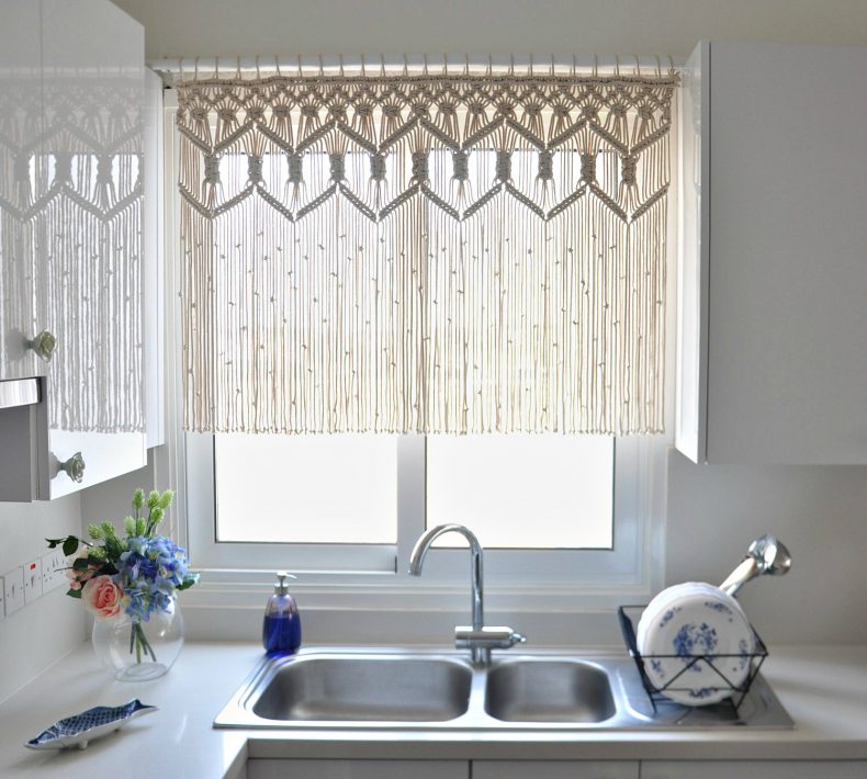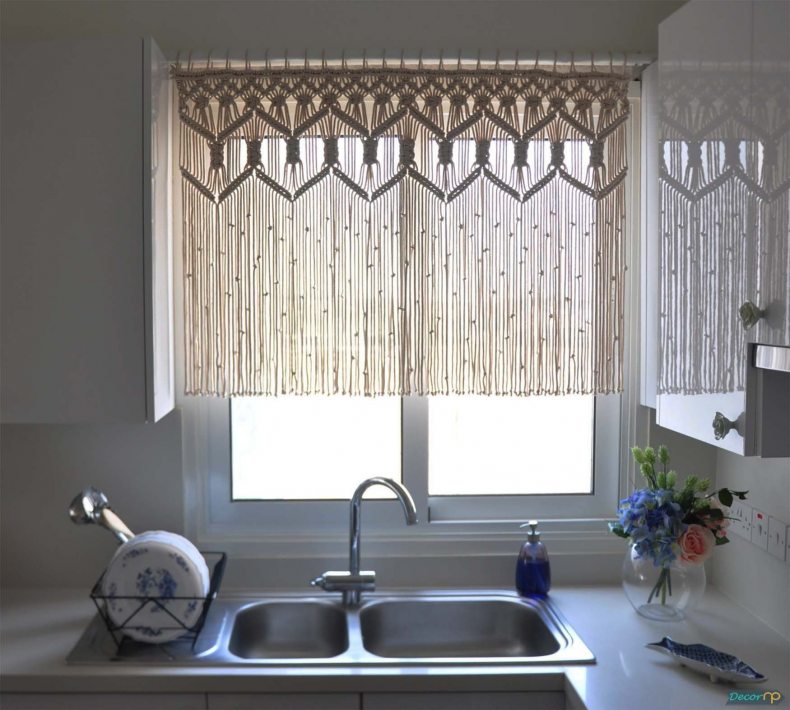 Оригинально на кухне смотрятся нитяные шторы. Их можно дополнить бусинами и другими декоративными элементами.