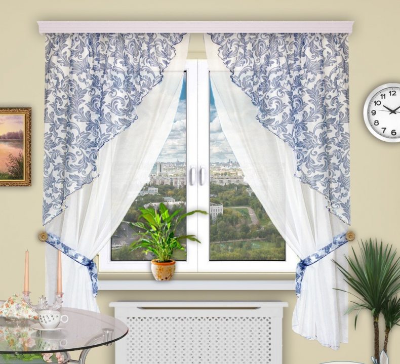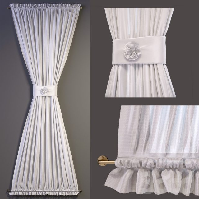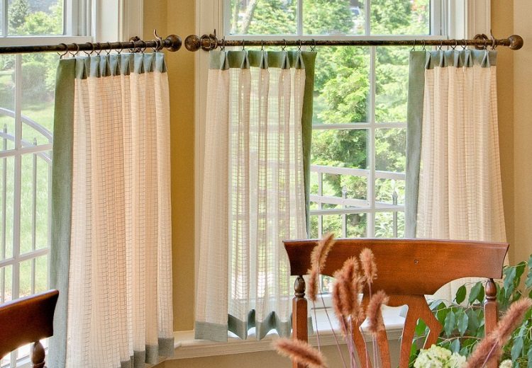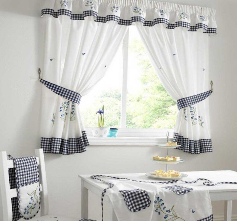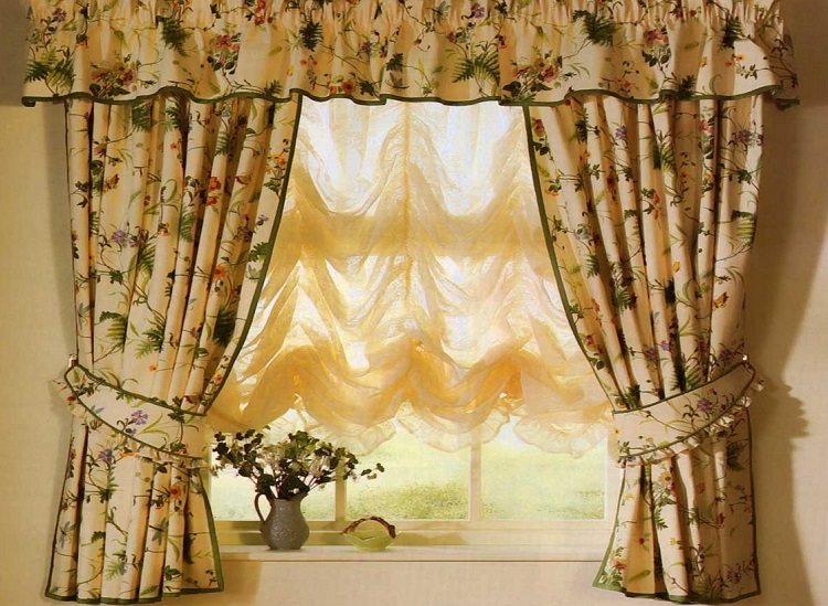 Для дополнительной отделки можно использовать кулиски, завязки, петли. Расцветка однотонная, в мелкий или средний цветочек, иногда мелкая клетка или полоска. Карниз также не должен иметь тяжелую конструкцию.
