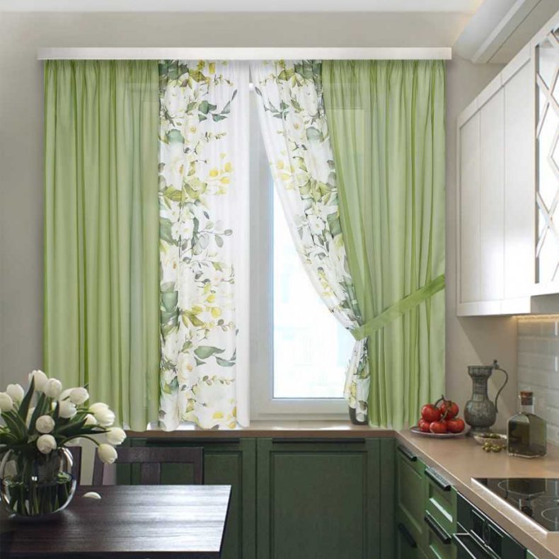 Это – классическое сочетание, которое применяется на 70% кухонь. Оно считается не просто красивым, но и очень функциональным. Тюль делает кухню лёгкой, а шторы помогают затемнить помещение при ярком солнечном свете.