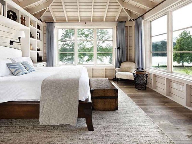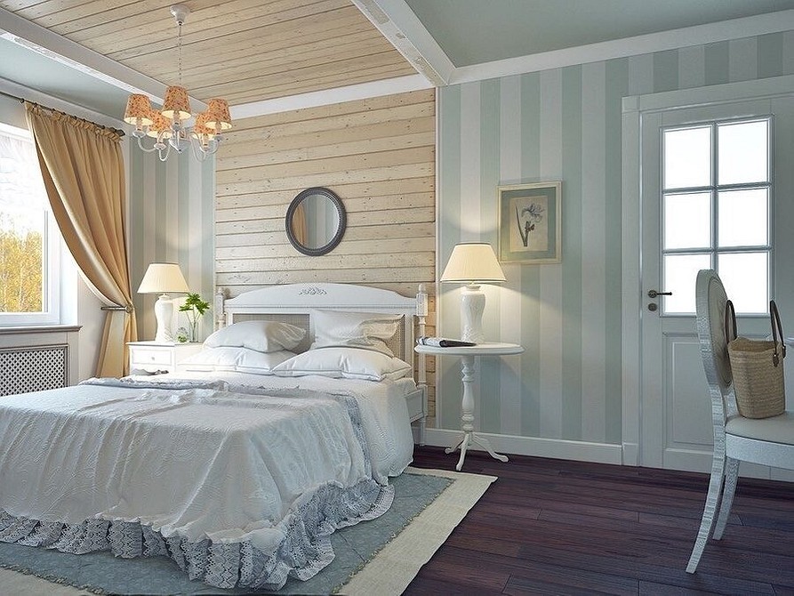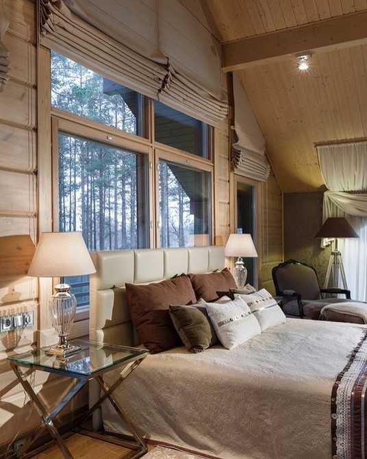 - Выбор отделки для интерьера спальни загородного дома тесно привязаны к конфигурации спальни мансардного типа;