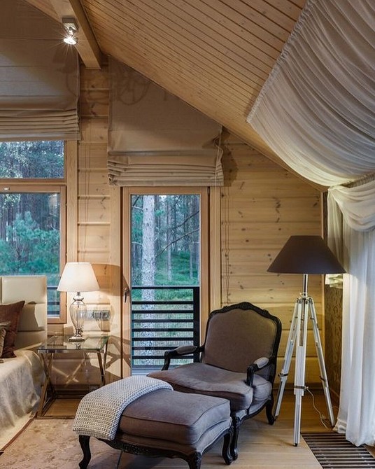 - Нужно учитывать, из какого материала построен дом. Например, со стенами, обшитыми деревянными панелями, гармонично смотрятся простые занавески или тюль.