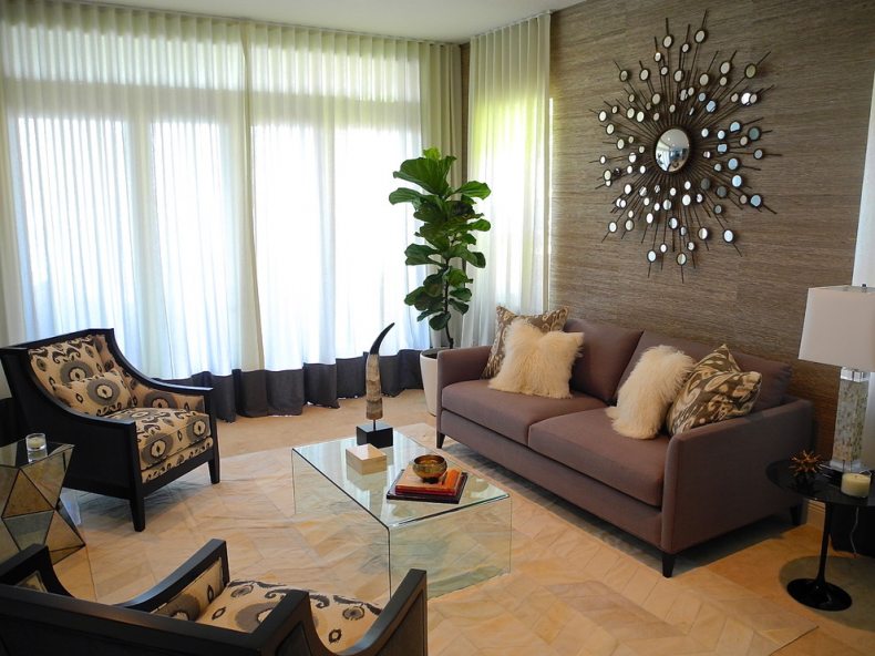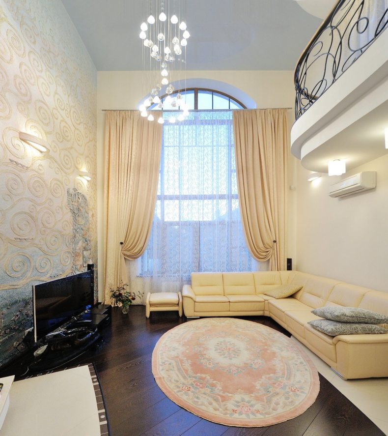 Комплект занавесей должен органично вписаться в интерьер, быть созвучным с остальными декорами по стилистике, цветовому оформлению. Следует обратить внимание на обивку мягкой мебели, текстуру, цвет стен (обоев), лепнину в интерьере.
