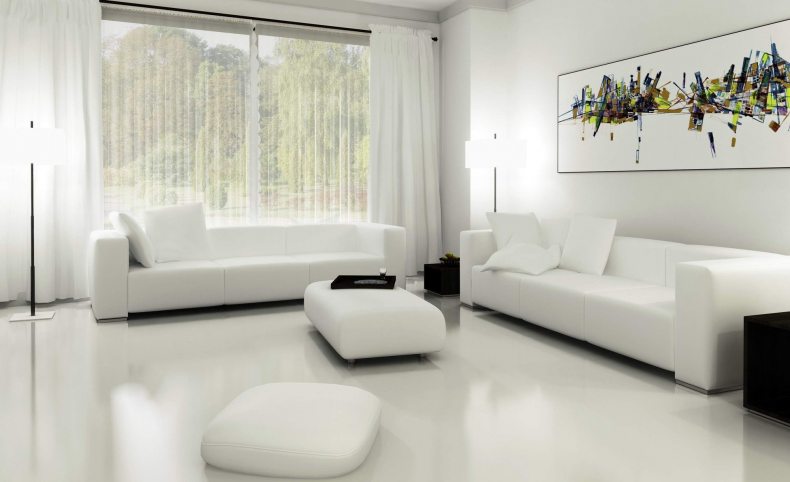Нестандартное, но модное и интересное дизайнерское решение — белое монохромное оформление гостиной. Пространство комнаты становится лёгким и воздушным. Окна визуально расширяются. Белый цвет имеет много оттенков, к примеру, лунный (с лёгкой желтизной), слоновой кости, фарфоровый (с примесью серого). Можно комбинировать оттенки. Монохромность белого разбавляют яркими акцентами деталей интерьера.