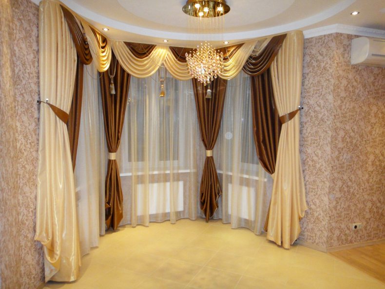 Несколько окон в гостиной и наличие эркера делают комнату светлой. Расширяются границы выбора, количества вариантов текстильного оформления окна. Основная задача, чтобы шторы в гостиной регулировали поток света и стали красивым декором.