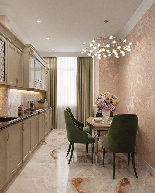 Комбинация с коричневым придаст интерьеру строгий и респектабельный вид. Атмосферу лёгкости и свежести можно создать, сочетая зелёные оттенки с нежно-голубыми, пепельными и серо-серебристыми.