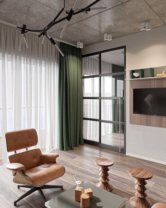 В качестве декоративных элементов можно использовать комнатные растения, аквариумы с рыбками. Зелёные шторы из грубых тканей добавят в интерьер яркость и выразительность.