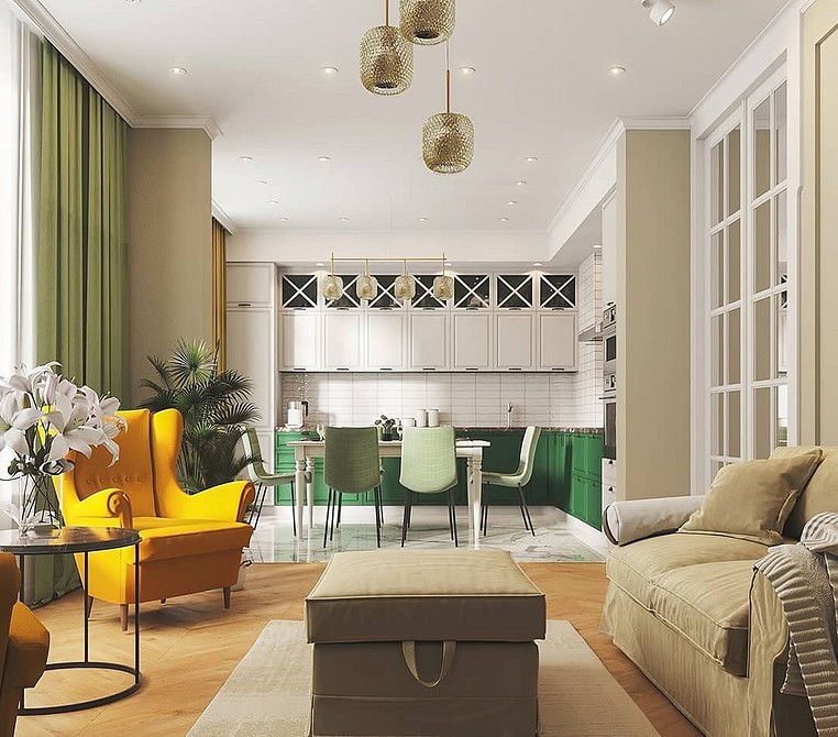 Зелёный может стать контрастным элементом по отношению к главному цвету: белому, серому, песочному и даже розовому. В любом сочетании гармонично смотрятся «съедобные» разновидности: оливковый, салатовый, яблочный, лаймовый, фисташковый.