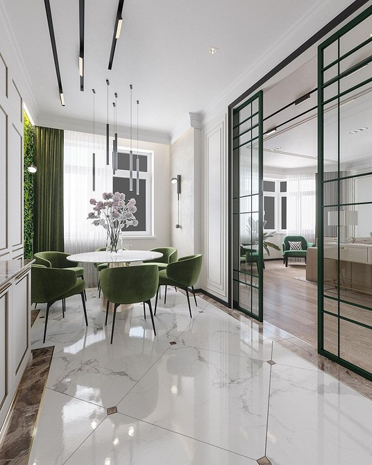 В современном интерьере глубокие и насыщенные зеленые оттенки можно использовать дозированно, для зонирования помещения или создания определенного настроения в комнате. Современная стилистика позволяет комбинировать разнообразные цвета, иногда даже несочетаемые.