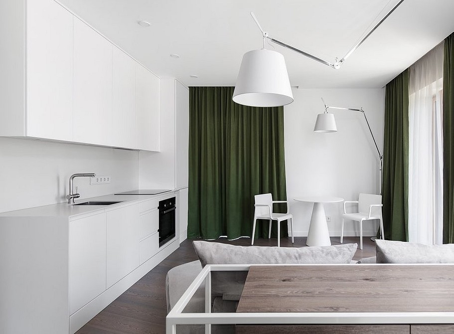 Преимущественно белое помещение можно украсить небольшим количеством зелёных элементов, например, частью стены, текстилем, декором.