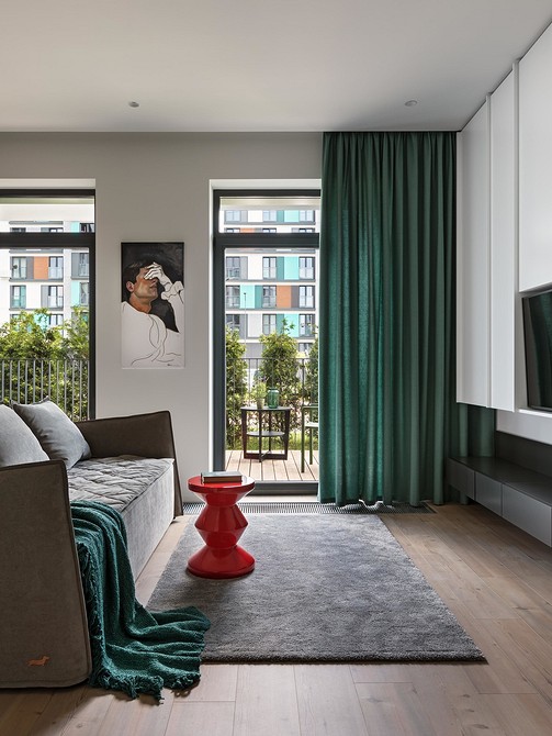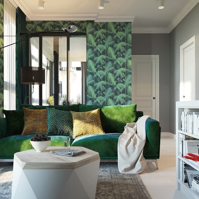 Однако переборщить с изумрудным отливом опасно — в большом количестве он будет подавлять все остальные цвета своей глубиной и сделает гостиную слишком темной. Именно поэтому его лучше использовать дозировано, как акцент. Текстиль на окнах в данном случае должен перекликаться по цвету с 1-2 элементами в гостиной. Это могут быть диванные подушки, плед, кресло или ковер.