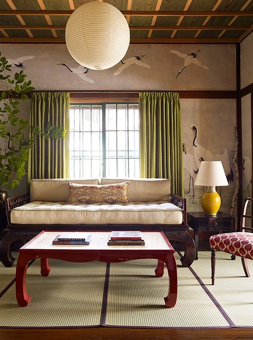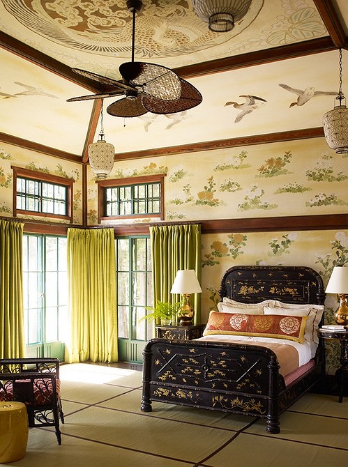 Интерьер в колониальном стиле характеризуется обилием деревянной мебели и покрытий, экзотических растений, натуральных материалов. Живописного эффекта можно добиться отделкой потолка декоративными тканями разнообразных естественных оттенков.