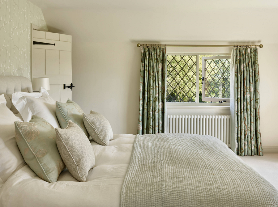 Комбинация деревянных элементов с натуральными оттенками в интерьере зелёной спальни позволяет создать дизайн в стиле Кантри или Прованс. Простое оформление, природная палитра, натуральные материалы, обилие текстиля, позволяют создать душевный интерьер в деревенском стиле. Зелёные шторы прекрасно подойдут под данное стилистическое направление.