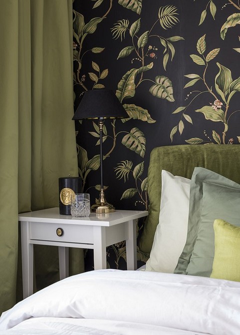 Тёмные тона изумруда и мха. Они очень подойдут для спальни, ведь глубокий бархатистый цвет успокаивает и помогает расслабиться.